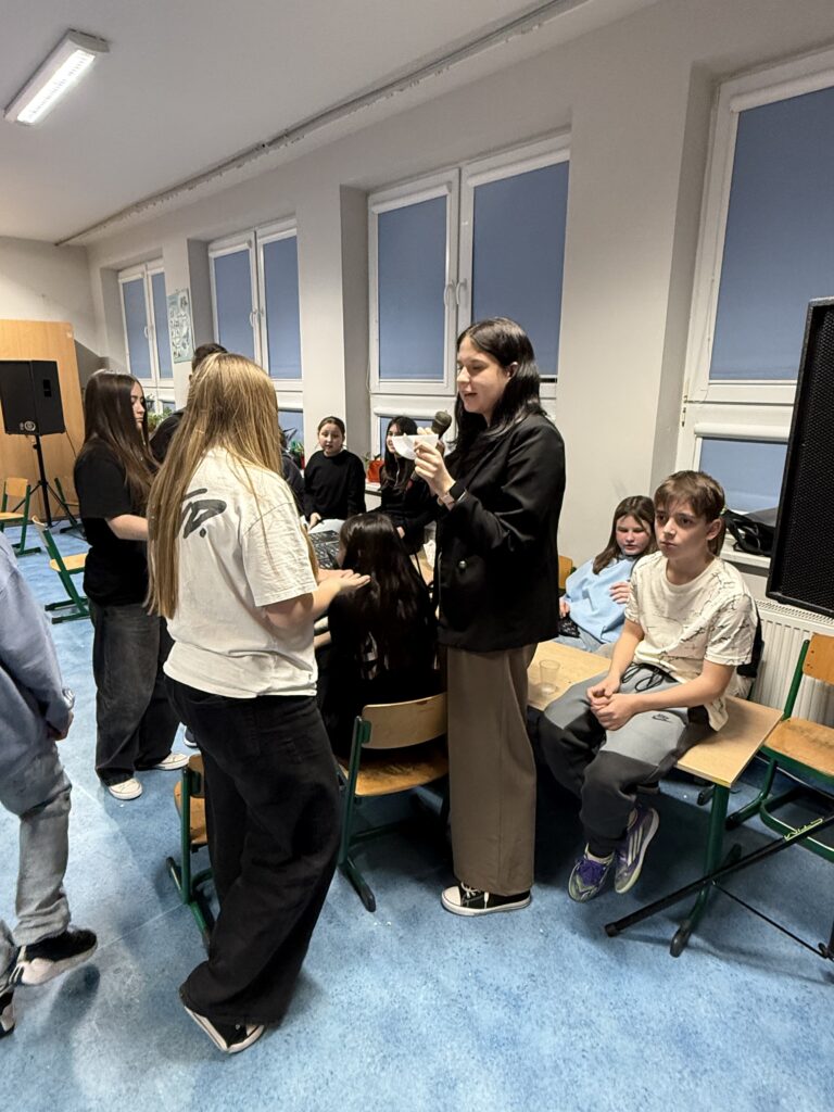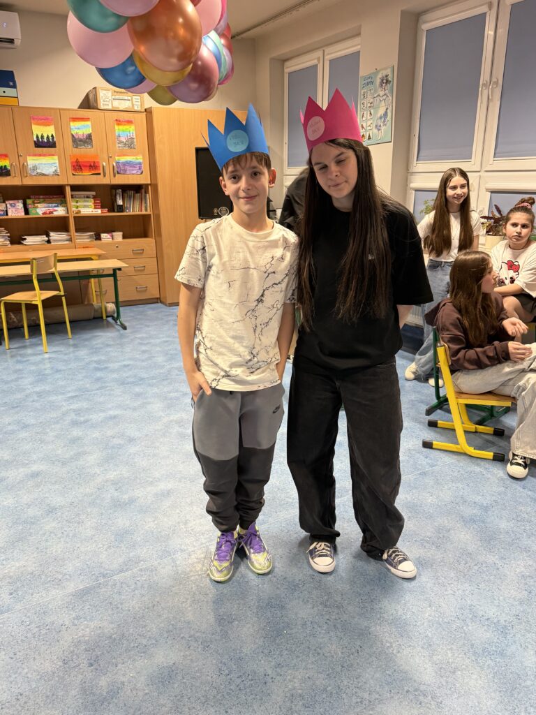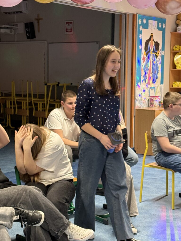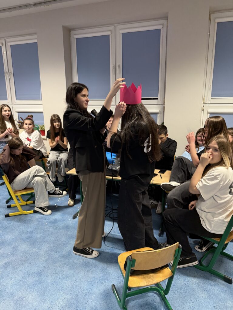W poniedziałkowe popołudnie odbyła się dyskoteka karnawałowo – walentynkowa dla uczniów klas IV – VIII, którą przygotował i przeprowadził Samorząd Uczniowski. Przewodnicząca szkolnego SU – Wiktoria Kądzioła – zaprosiła wszystkich uczestników nie tylko wspólnej zabawy w rytm ulubionych piosenek i tanecznych hitów, ale zorganizowała również szkolny turniej muzyczny „Jaka to melodia” oraz wybory Króla i Królowej szkolnego balu. Konkursowi towarzyszył ogrom pozytywnych emocji oraz zacięta i mocno wyrównana walka w wyścigu po Dyskotekowy Mikrofon – główną nagrodę w turnieju. A należy przyznać, że piosenki były trudne i wymagały znajomości muzycznych hitów nawet sprzed kilkunastu lat. Najważniejsze miejsce na podium wywalczyła Julia Ziętarska z klasy VIII, uzyskując ogromną przewagę punktową nad pozostałymi uczestnikami. W wyborach na królewską parę dyskoteki, podobnie jak w minionym roku, zwyciężyli Eliza Jaskier i Filip Ustupski, reprezentujący klasę VII. W przerwie od dyskotekowego szaleństwa, Samorząd Uczniowski częstował przybyłych uczniów pysznym popcornem, który zdecydowanie dodawał sił do dalszej zabawy! Serdecznie dziękujemy szkolnym samorządowcom za zorganizowanie tego fantastycznego spotkania!