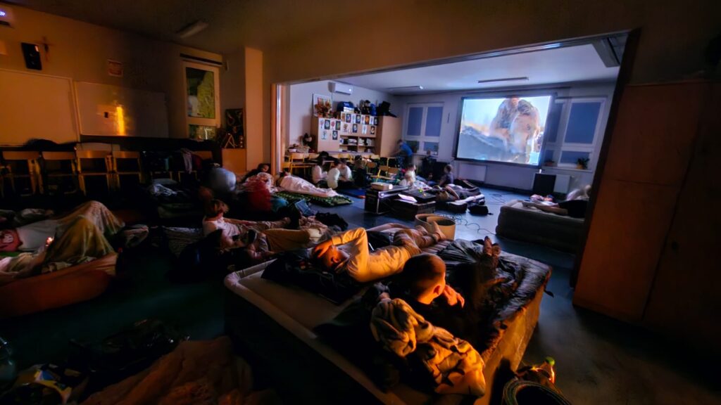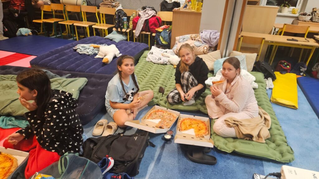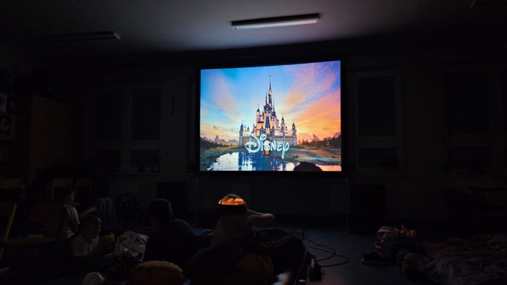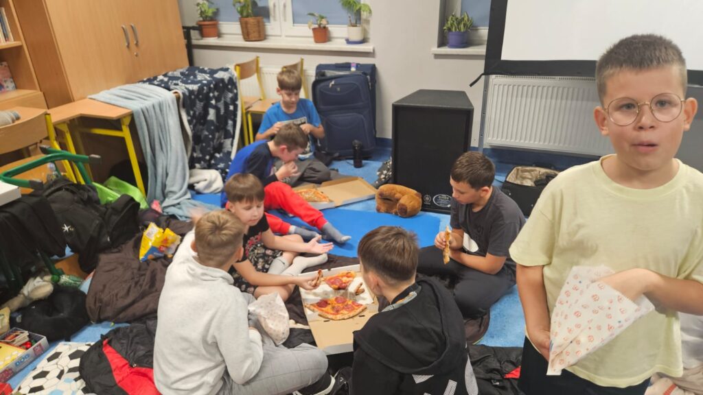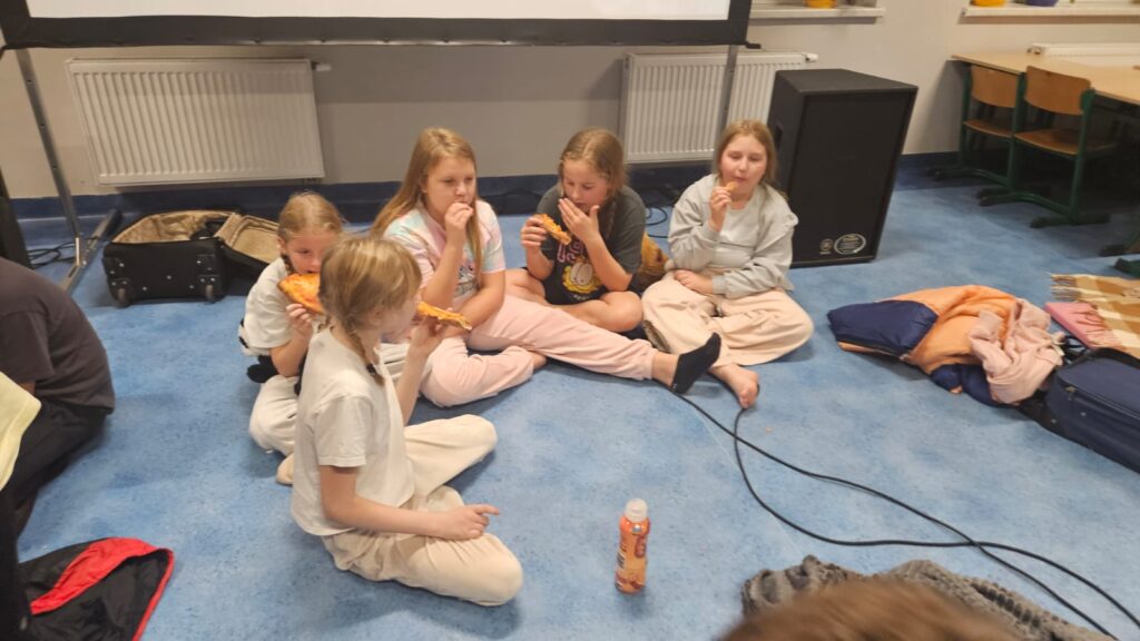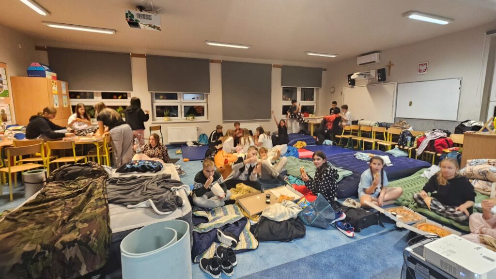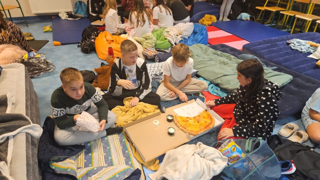 rozmawiając i dobrze się bawiąc. Dlatego17 października postanowiliśmy zamienić sale lekcyjne na wielką, szkolną salę filmową. Wygodne materace, puchate poduszki i ciepłe koce to tylko część wyposażenia szkolnego kina. Nie zabrakło też pachnącego popcornu, wspólnych gier i dużej dawki śmiechu! Po intensywnym wieczorze, przyszedł czas na krótki odpoczynek, choć nie wszyscy dali się przekonać do snu! Impreza zakończyła się następnego dnia o godzinie 7:00, kiedy uczniowie wrócili do domów. Szkolne nocowanie okazało się doskonałym sposobem na integrację, rozmowę, dobrą zabawę i budowanie pięknych, szkolnych wspomnień!