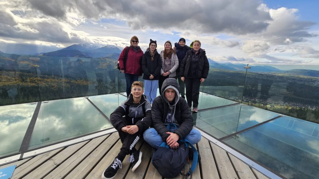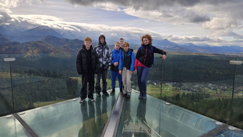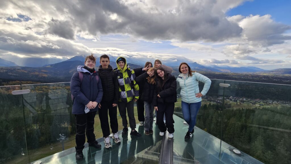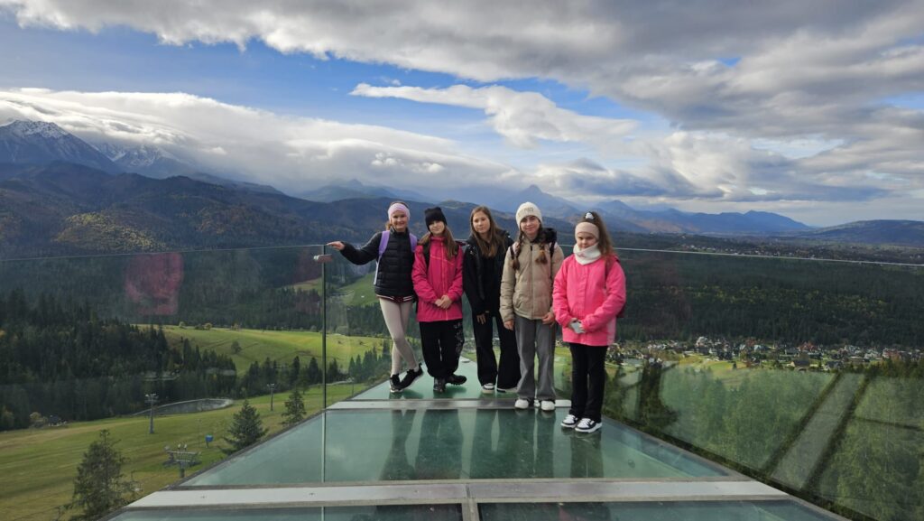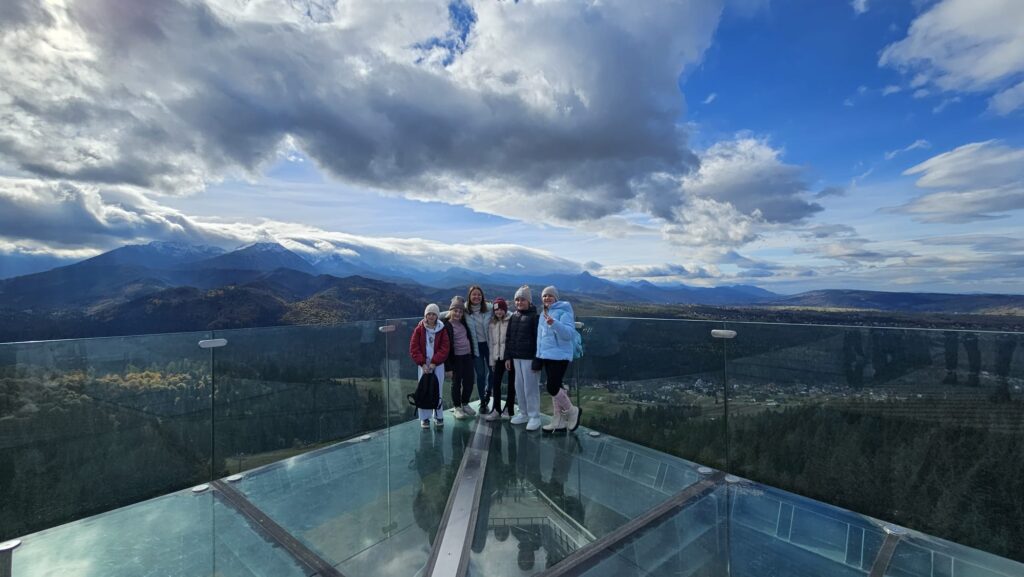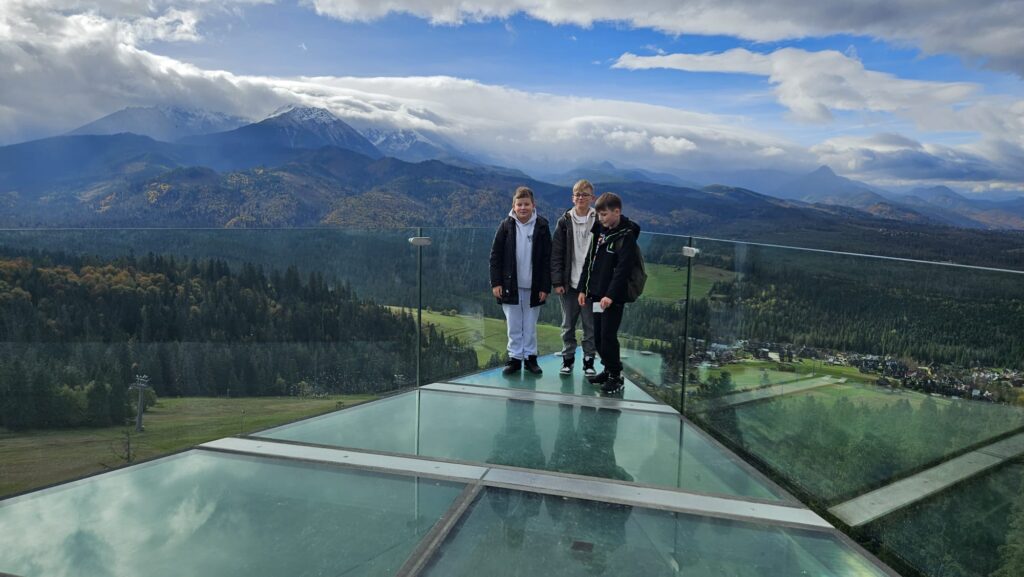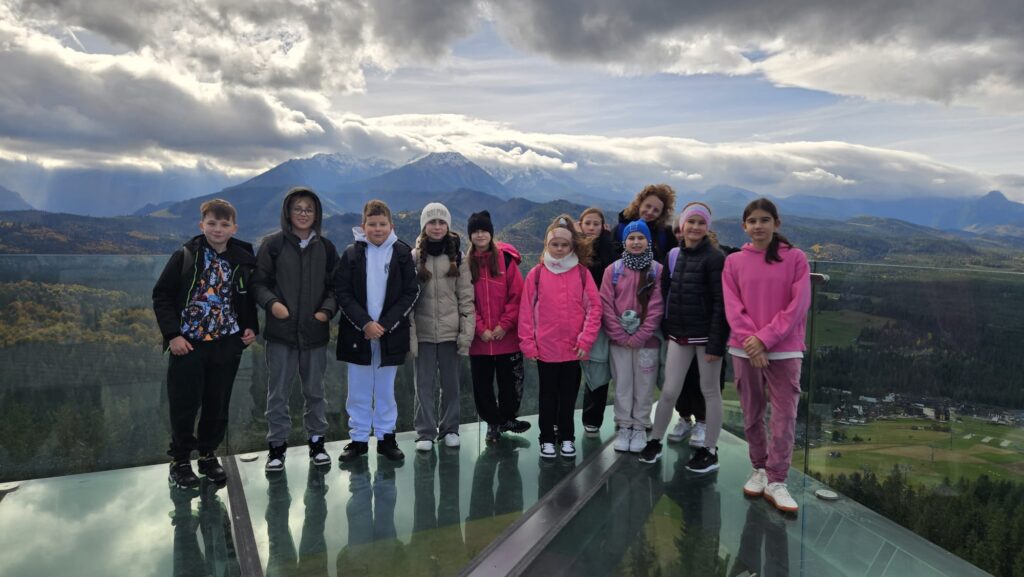 Prawdziwa, polska i złota jesień, zachęciła nas do podróży do podnóży polskich Tatr. Ciepłe dni i przyjemnie grzejące słońce to doskonała okazja do aktywności na świeżym powietrzu, połączonej z edukacją i dobrą zabawą. Uczniowie z klas IV – VIII, korzystając z sprzyjających warunków atmosferycznych biorą udział w trzydniowej wycieczce na Podhale. W pierwszym dniu wyprawy pokonywali swój lęk wysokości i przestrzeni spacerując po ścieżce w chmurach „Sky Walk” w Poroninie. Spacer okazał się niezapomnianym przeżyciem! Popołudnie upłynęło pod znakiem spacerów i sportowej aktywności na terenie ośrodka, w którym nocują uczniowie. Dzień pełen emocji, zakończył się wspólnym ogniskiem i pieczeniem kiełbasek. Czekamy na kolejną porcję wrażeń i wspomnień!