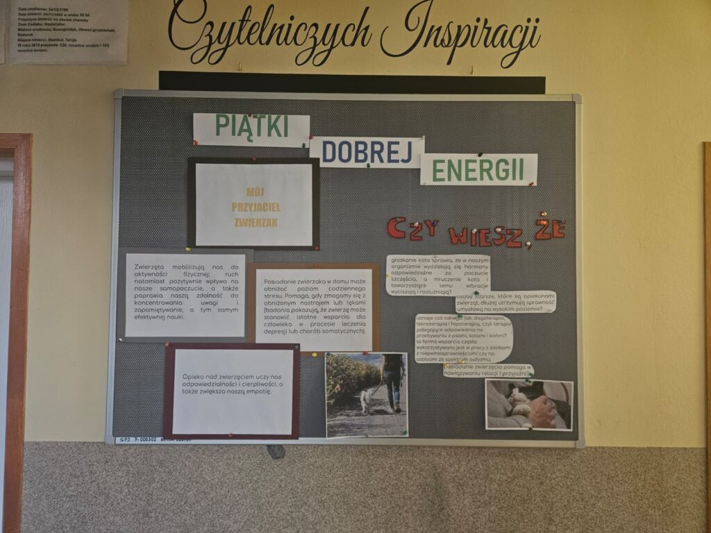 W grudniu kontynuowaliśmy Piątki Dobrej Energii, tym razem skupiając na tematyce relacji ze zwierzętami domowymi. Na parterze w naszej szkole możemy obecnie oglądać wystawę zdjęć zwierzęcych przyjaciół naszych uczniów. Różnorodność jest duża – choć dominują koty i psy, to pojawiły się wśród nich również kury, chomiki, myszki, króliki, a nawet kózka.