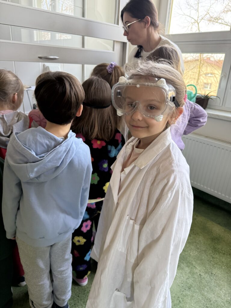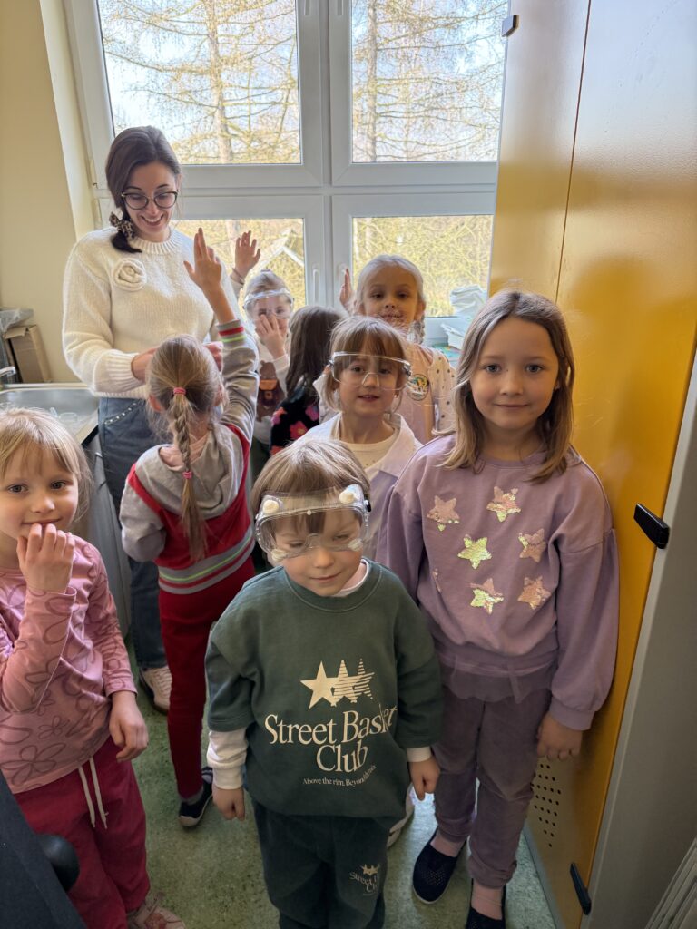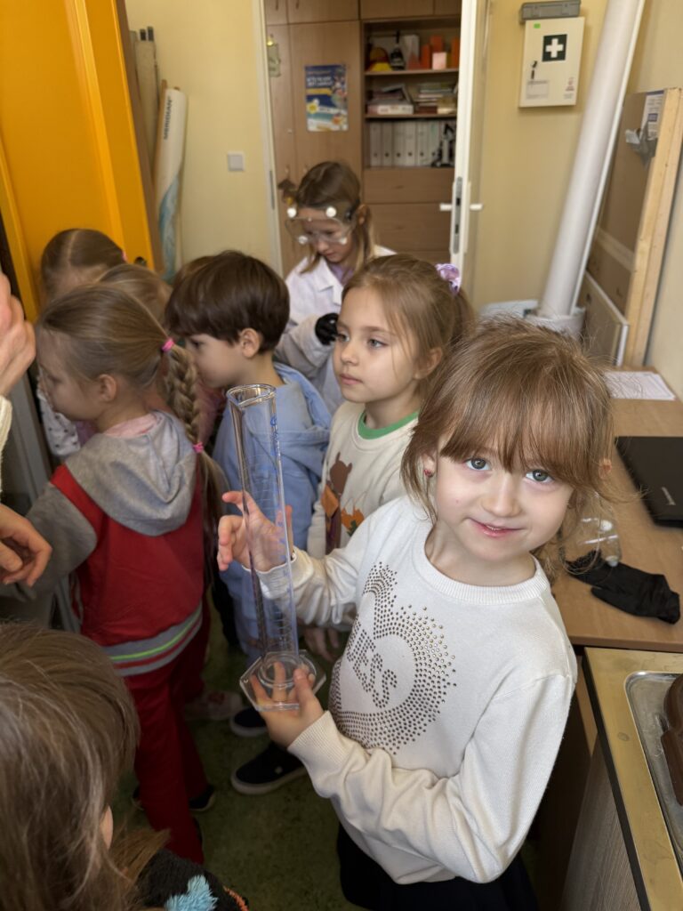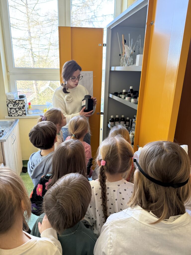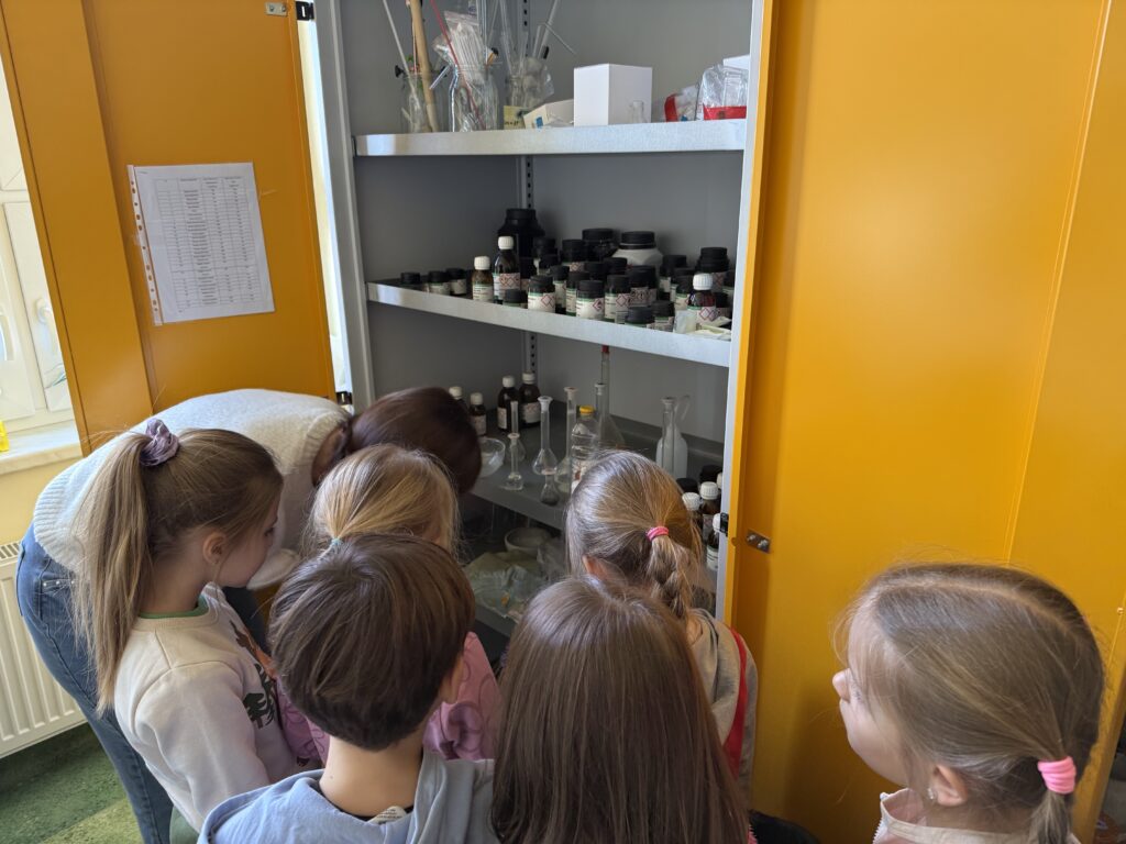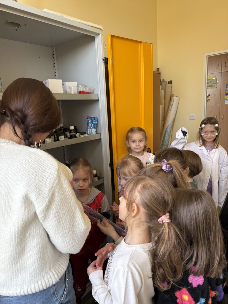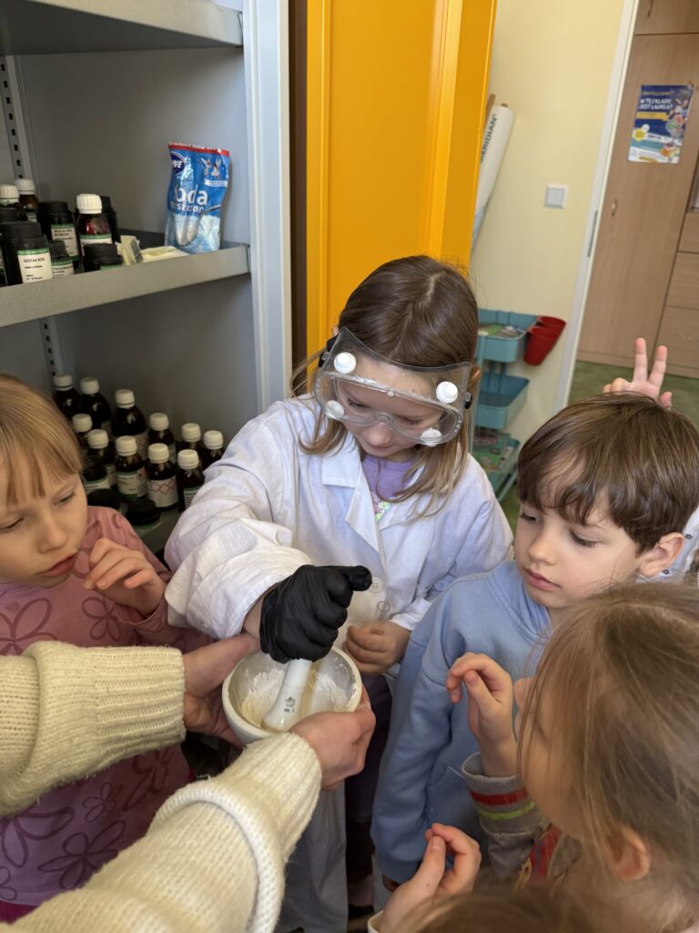 W piątkowe przedpołudnie, przedszkolaki postanowiły odwiedzić szkolną pracownie chemiczną. Podczas krótkich odwiedzin, zobaczyły zaplecze chemiczne z szafą na odczynniki oraz szkłem chemicznym. Dzieci z dużą ciekawością oglądały probówki, zlewki i statywy chemiczne oraz spróbowały własnych sił w rozcieraniu kredy w laboratoryjnym moździerzu. Ogromne zainteresowanie małych naukowców wzbudził także fartuch chemika oraz ogromne okulary ochronne. Zajęcia zostały zrealizowane w ramach tygodniowego tematu poświęconego laboratoriom i pracy w nich.