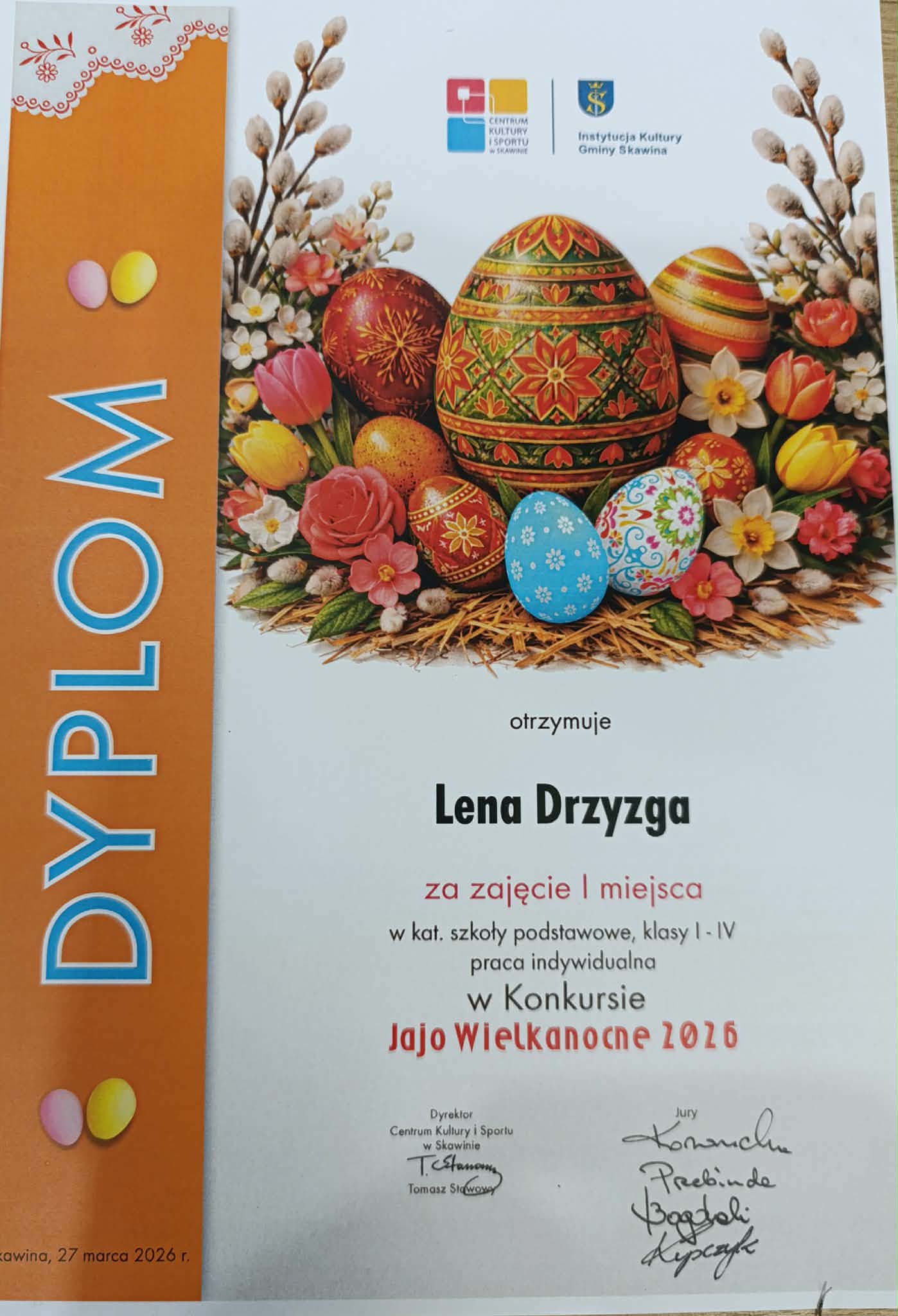27 marca w skawińskim Pałacyku Sokół odbyła się prezentacja prac konkursowych, złożonych w ramach wydarzenia zorganizowanego przez Centrum Kultury i Sportu w Skawinie. Zadaniem uczestników było przygotowanie wielkanocnej pisanki #D w dowolnej technice artystycznej, o wysokości przekraczającej 20 cm. Ogromna ilość złożonych prac sprawiła, że konkursowe Jury miało niezwykle trudne zadanie. Po długich i wymagających obradach, komisja wyłoniła zwycięzców, a wśród nich uczennicę Szkoły Podstawowej w Jaśkowicach. Lena Drzyzga z klasy III zajęła I miejsce w kategorii klas I – IV, prace indywidualne. Lena wykonała niezwykle pracochłonną i wymagającą pisankę, bardzo starannie wyklejoną różnorodnymi nasionami! Serdecznie gratulujemy tak fantastycznego wyniku w konkursie oraz przepięknej i oryginalnej pracy!