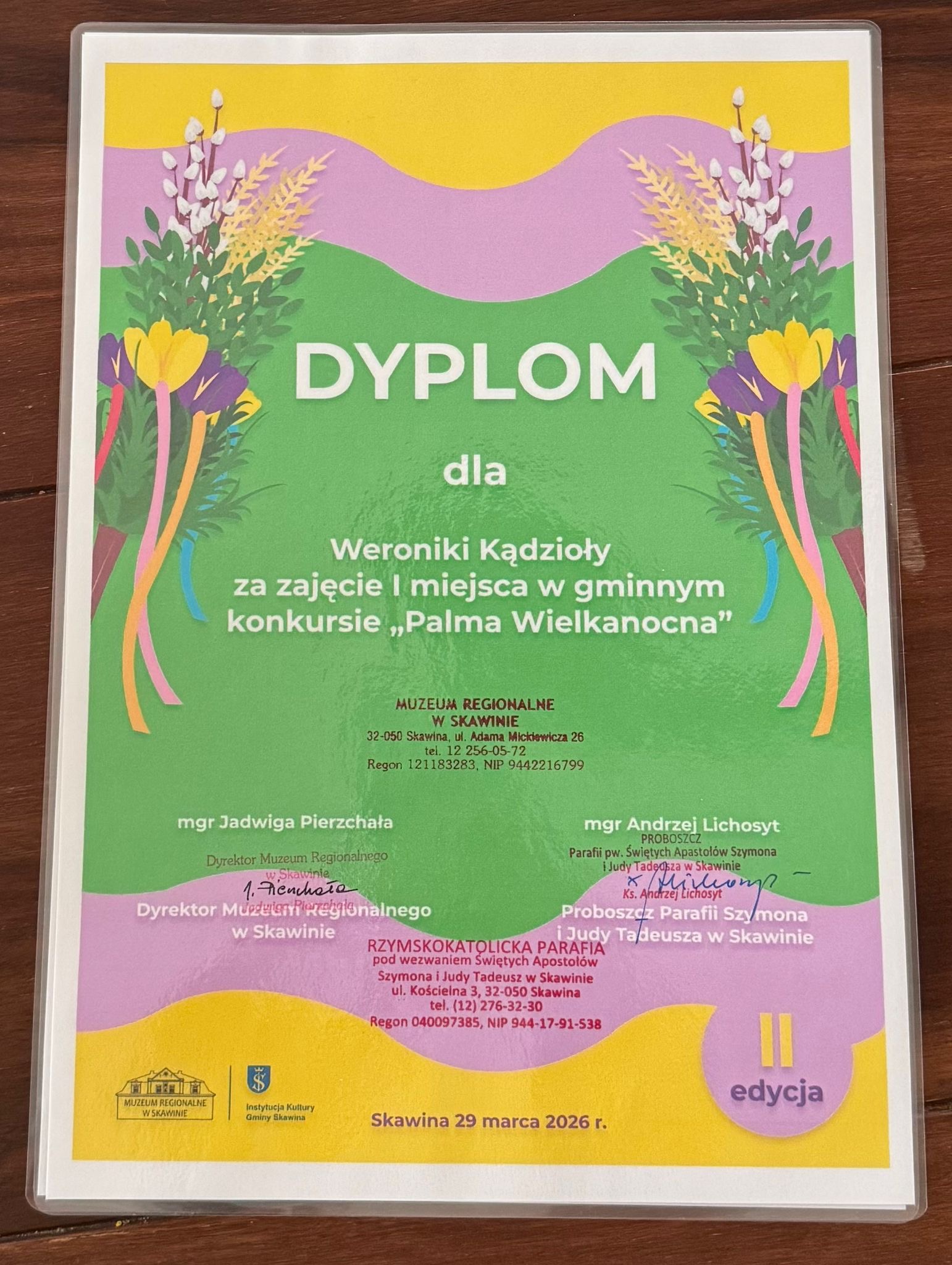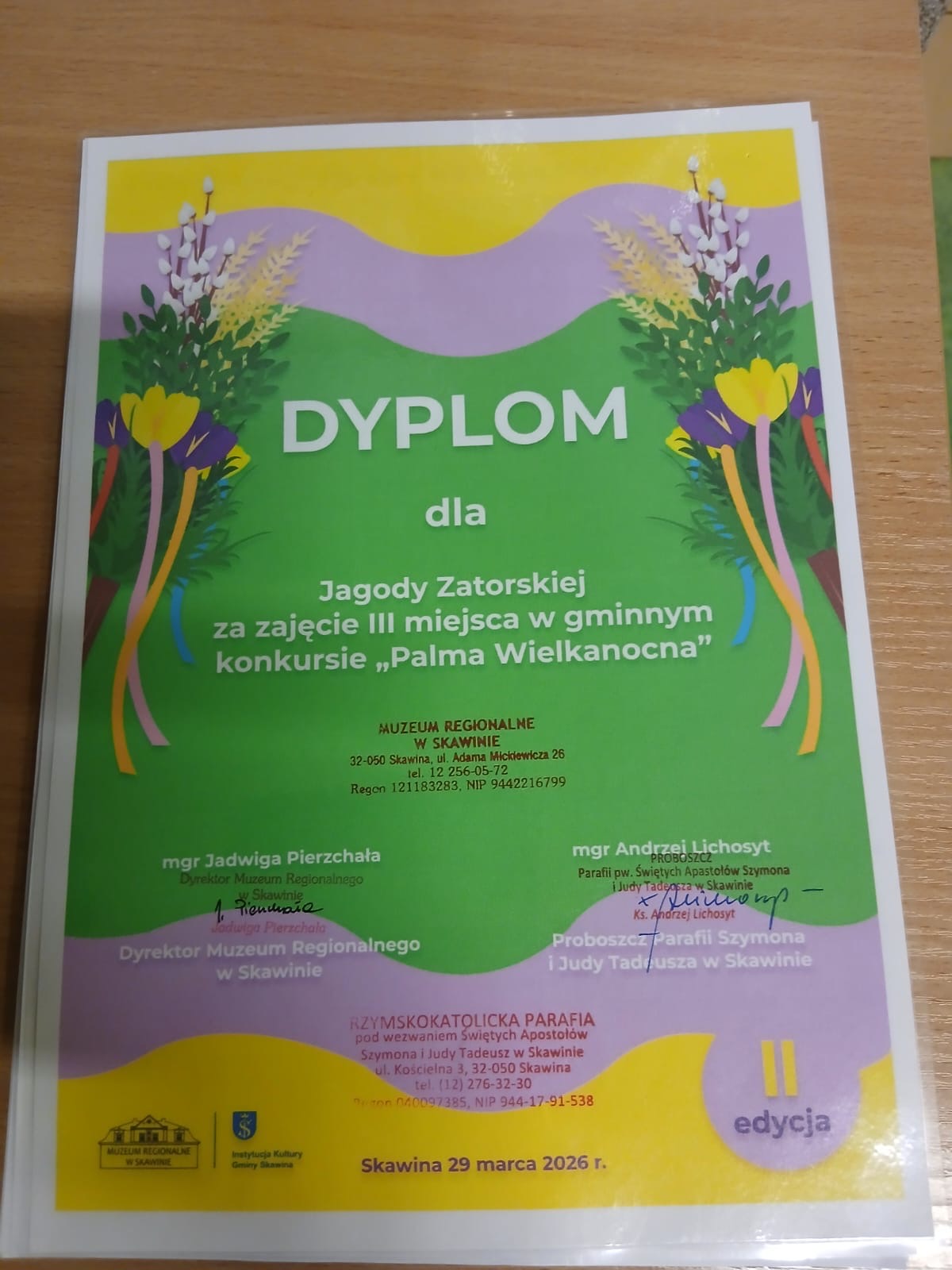 Z radością informujemy, uczennice Szkoły Podstawowej w Jaśkowicach zajęły miejsca na podium w konkursie artystycznym, zorganizowanym przez Muzeum Regionalne w Skawinie oraz Parafię pw. Szymona i Judy Tadeusza w Skawinie. Tematem przewodnim wydarzenia była „Palma Wielkanocna”, a rozstrzygnięcie gminnej rywalizacji odbyło się w Niedzielę Palmową. W kategorii wiekowej klas I – III pierwsze miejsce wywalczyła Weronika Kądzioła z klasy I, a w kategorii klas starszych IV – VIII, trzecie miejsce osiągnęła Jagoda Zatorska z klasy V.