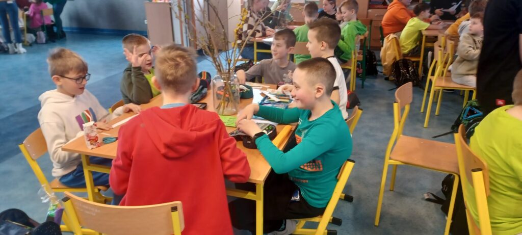 Następnym punktem programu były warsztaty w stylu „Eco”, przygotowane przez panią Lilianę Czopek. W trakcie zajęć dzieci wycinały i sklejały papierowe opaski oraz ochoczo ustrajały bibułą gałązki, aby kolorowo przywitać wiosnę własnoręcznie wykonanymi, tradycyjnymi gaikami wiosennymi.